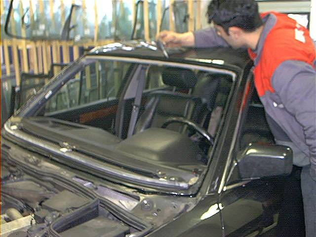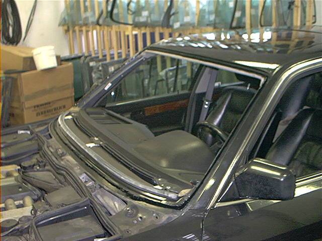 With 2 people the new windshield was installed, carefully pushing the window into the sealant and making sure the ornamental strips align with the body: