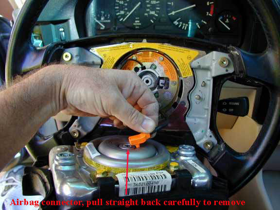 Next you carefully lift the airbag assembly off of the wheel and disconnect the plug on the back. It comes straight out to remove.