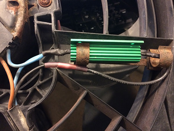 The two speed fan setup works on two voltages. It’s a basic DC motor with two wires, but with two voltage sources. As the only common high current voltage source is the 12VDC system, you can only step down. BMW has designed a fan system that’s designed to operate (at least in this car) without active cooling in temperate climates. When an additional load is applied (such as the A/C compressor) or temperature rises to a sufficient level (the low temp switch on the coolant temperature sensor), the low speed side of the circuit is activated. When this side of the circuit is active, the 12VDC is stepped down through a large resistor on the fan housing (speculated to be 0.5 Ohms, 85 Watts OEM for the 318ti). This allows the fan to run continuously at a lower voltage, while dissipating excess current through the resistor to create the voltage drop. Due to the location and heat cycling of these resistors, they fail over time. The only way to fix this is to replace the resistor or the fan assembly as a whole (salvage or new for ~$300-400).