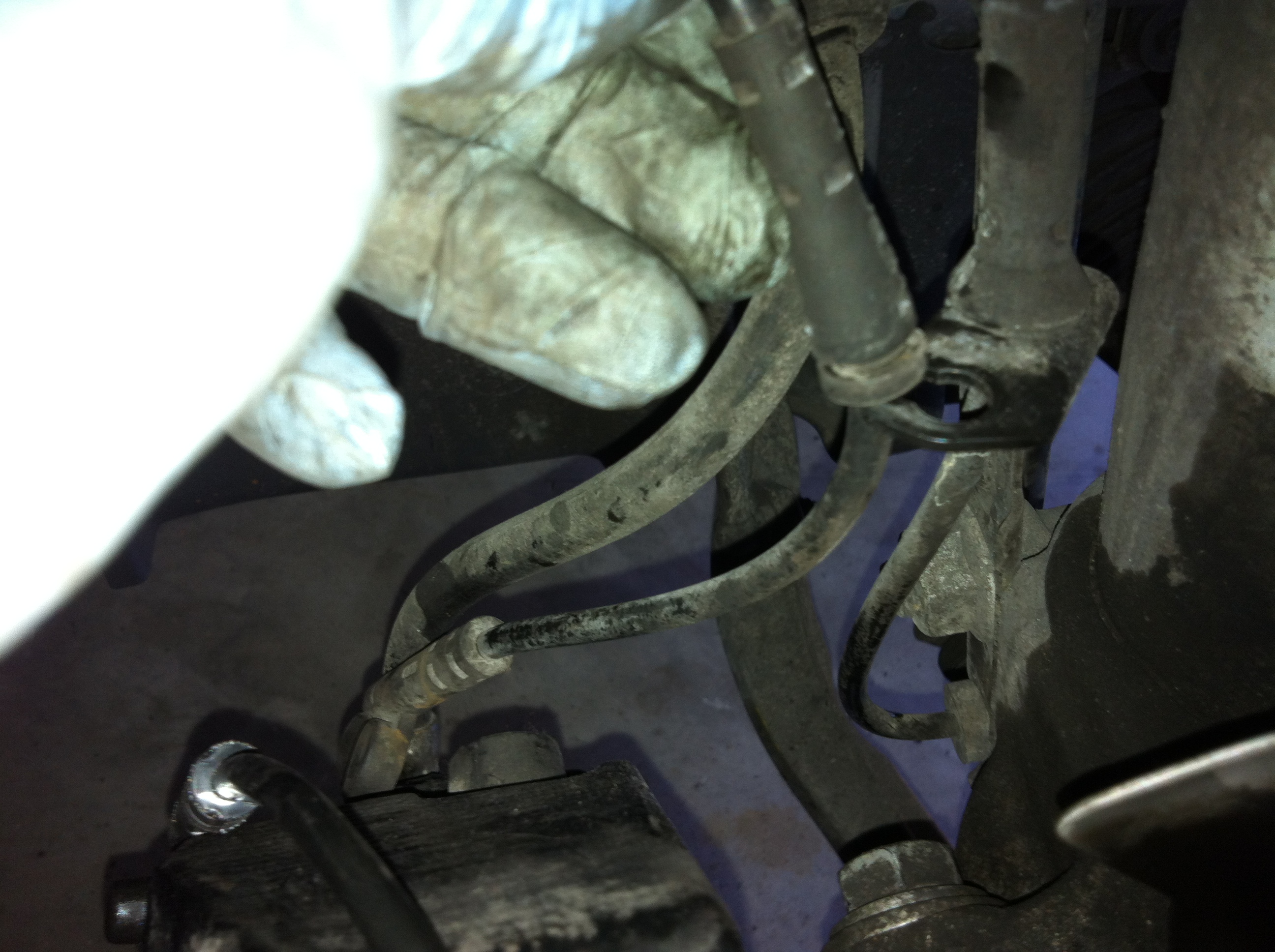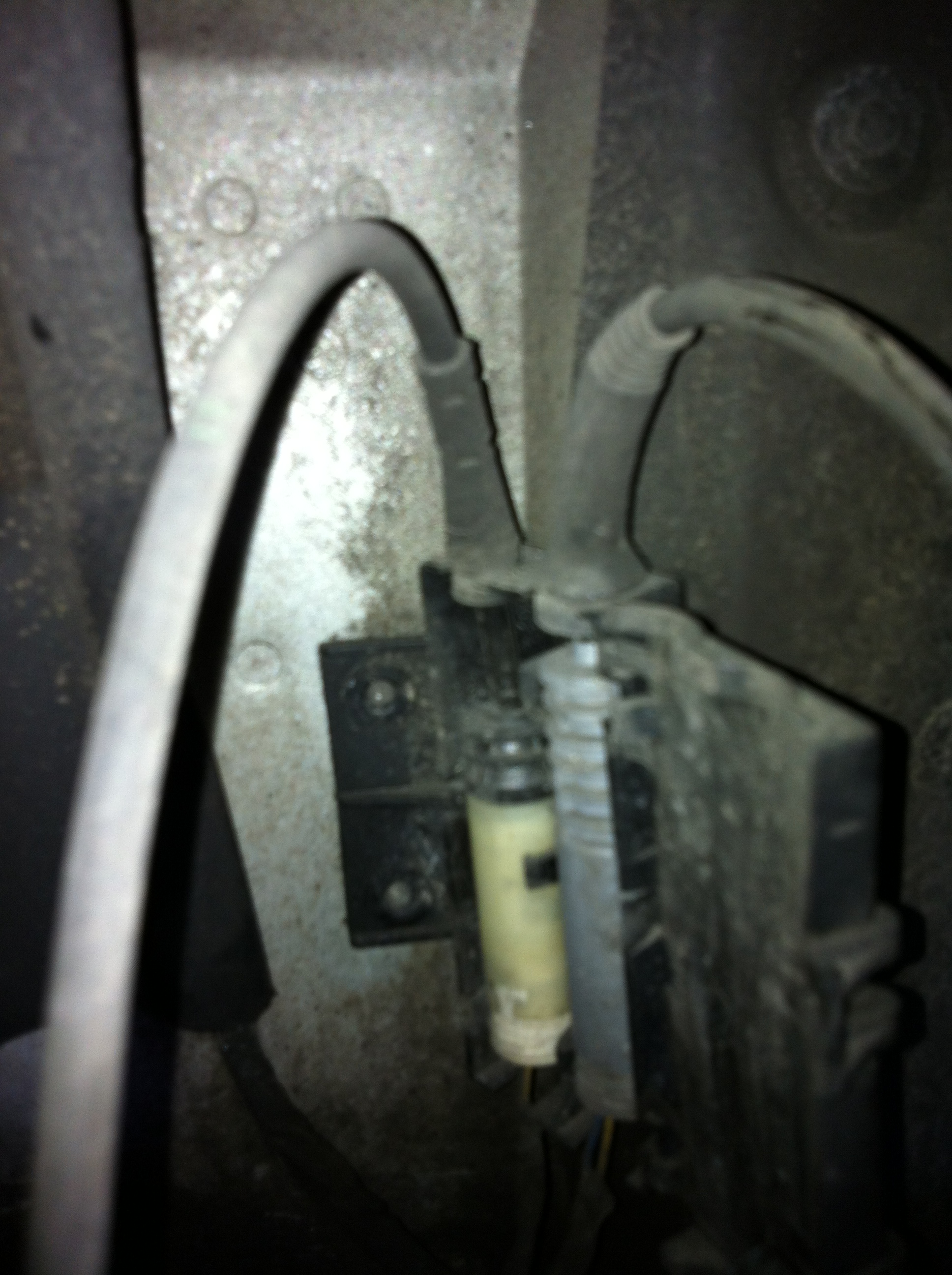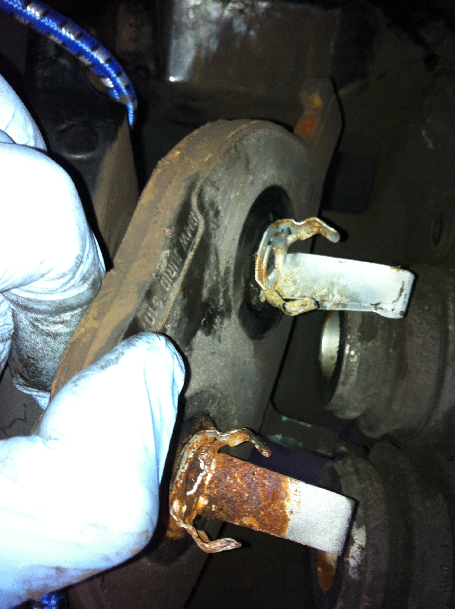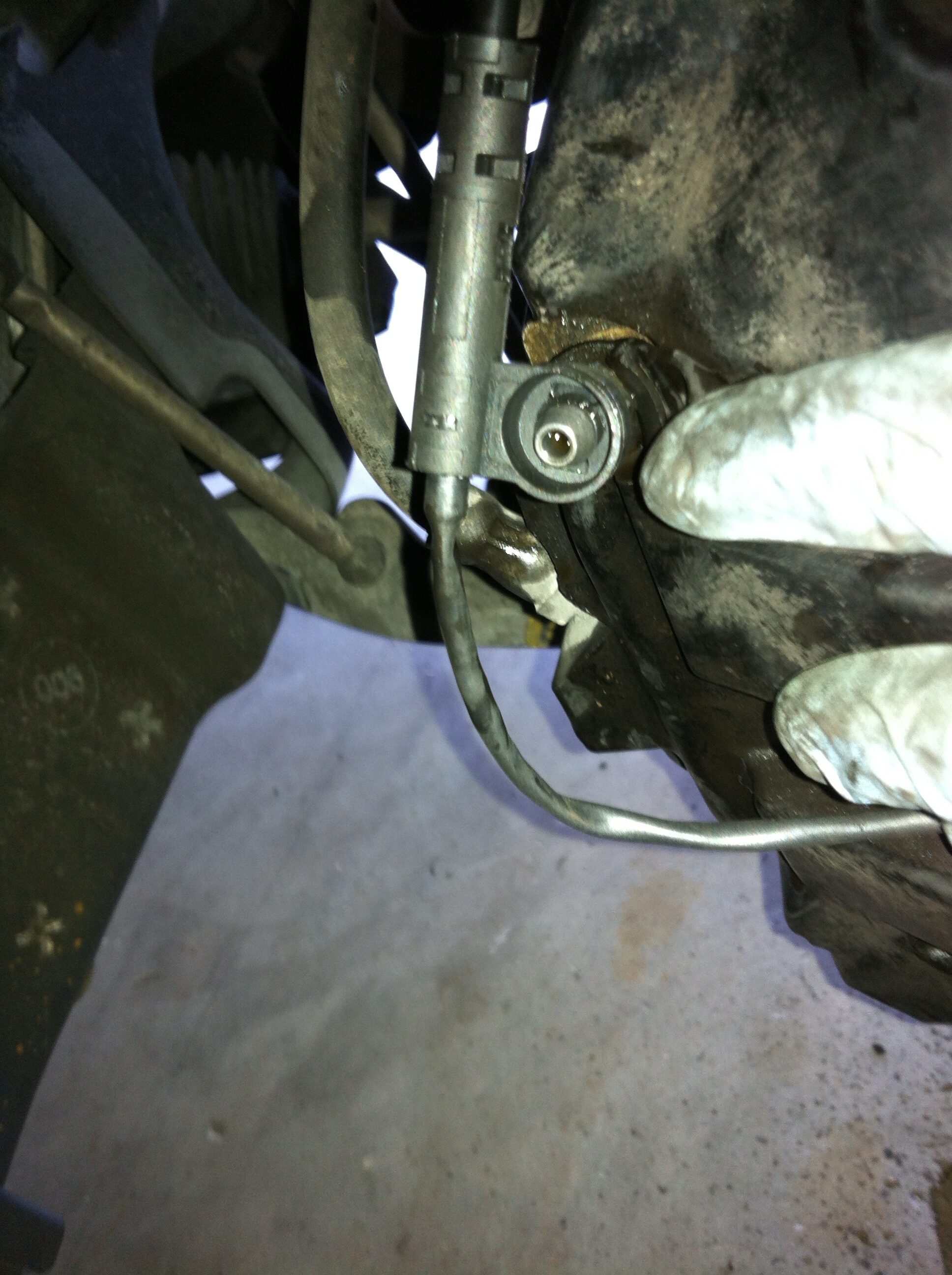 Step 17: The bottom pad is the one that sits on top of the pistons AND is connected to the brake sensor. The picture below shows the sensor connected to the pad (old).