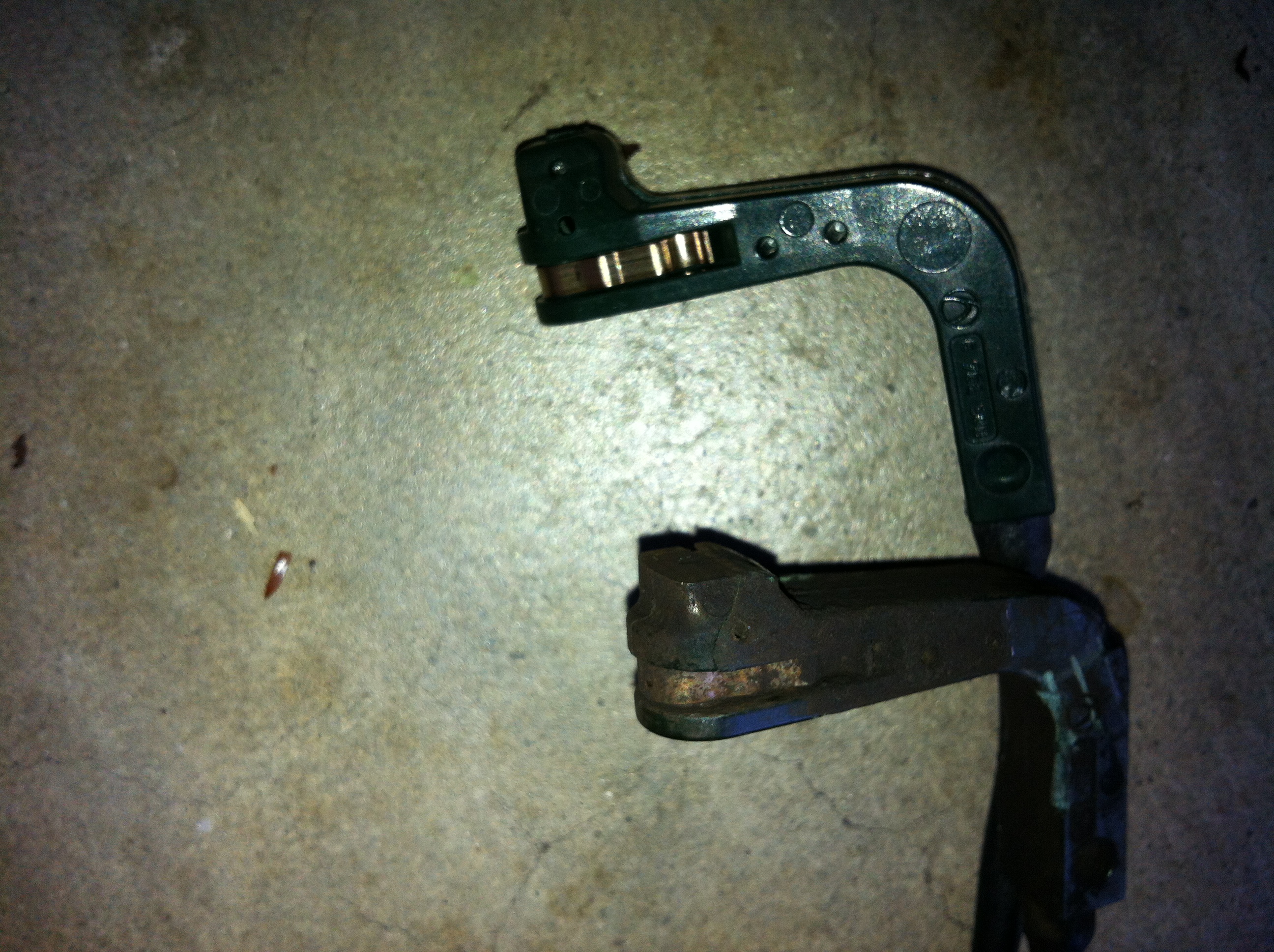 Apparently the sensor gets worn down along with the pad. The sensor is only $26.25 (each), so it’s not that big of an expense. Besides, it just made sense to me to put new sensors in along with the new pads and rotors. Below is a picture of the old and a new one to give you an idea of the wear on the sensor (top = new, bottom = old):