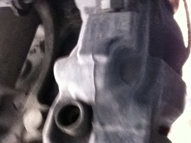 Step 8: On the back side of the caliper, locate two plastic plugs at the top and bottom of the caliper. GENTLY pry these plugs off to expose the guide screws. The caps are not that difficult to remove and they pop right off. Once removed, set them aside. Below is a picture with the bottom plug removed (it was difficult to get a good picture of this, as the angle was pretty tough).
