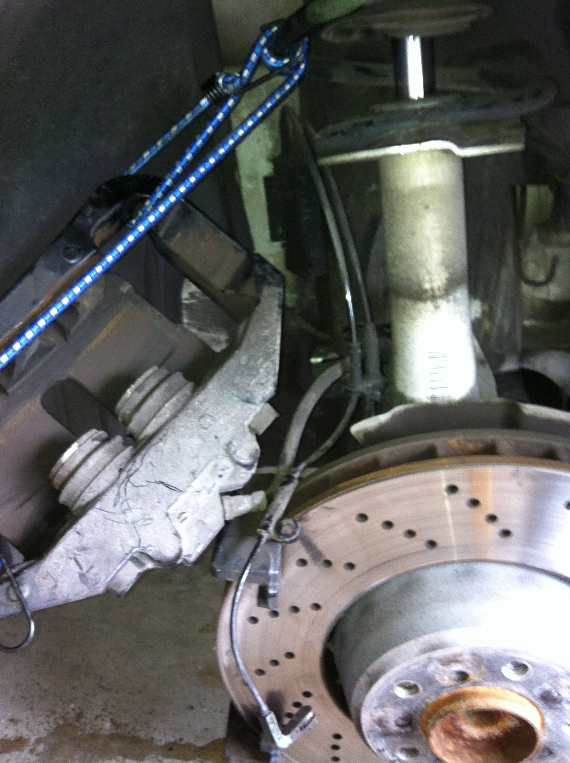 Step 12: WITH THE CALIPER IN YOUR HAND, use the bungee cord to support the caliper. I wrapped the bungee cord through the caliper and suspended it from my coil. This is important because you DO NOT want to put any stress on your brake line. How ever you suspend the caliper, make sure that the brake line is not kinked and that the caliper is hanging BEHIND or to the SIDE of the rotor.