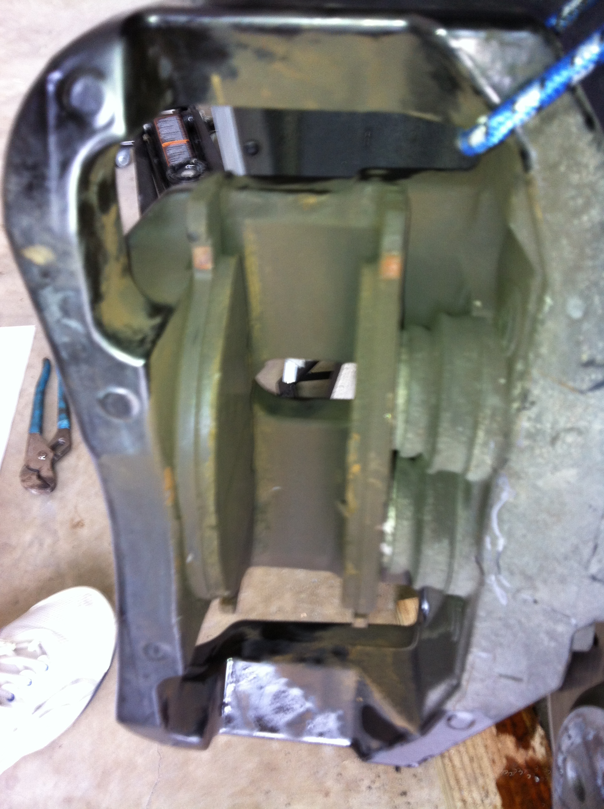 Step 9: Use the other 50% of your patience to re-insert the retaining spring. I placed the middle of the spring in first, held it in place with my foot and used the channel locks to work the top and bottom of the spring in place. I am telling you know, that it will test all of your religion (if you have any) and you will be tempted to cuss. If you have a friend, they can guide the top and bottom of the spring forward with the screw driver as you pull the top and bottom edges of the spring toward you with the channel locks. Again, this requires a lot of patience, so take your time.